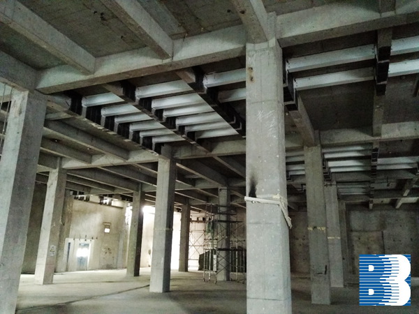 從2015年11月下旬開始,我院鋼結構研發中心在招投標工作結束之后,及時對施工圖深入細化,優化施工方案,科學展開各項施工作業。整個項目的重點和難點在于對地上一、二層頂板H型鋼梁進行加固,以及鋼梁端部原框架梁碳纖維的加固補強等方面。為此,研發中心的技術人員分別采用了鋼結構鋼梁制作安裝、對框架梁進行碳纖維加固等方式。