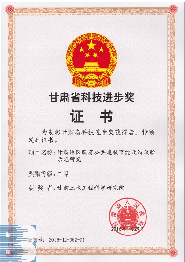《甘肅地區既有公共建筑節能改造試驗示范研究》(2015年度甘肅省科技進步二等獎)